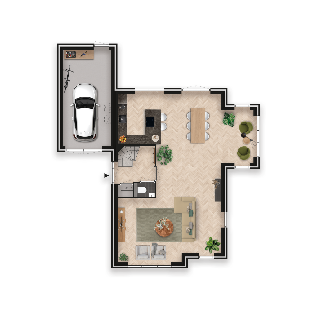 Je betreed de woning aan de zijkant van de woning. Bij binnenkomst tref je een ruime hal met toilet en toegang tot de woonkamer. De lichte en sfeervolle woonkamer is tuingericht en biedt voldoende plek voor een royale zithoek. Dankzij de grote raampartijen en een erker aan de zijkant van de woning geniet je hier de hele dag van veel natuurlijk licht. Aan de achterzijde bevindt zich de moderne open leefkeuken met ruimte voor een gezellige eethoek. Daarnaast beschikt de woning over een aangebouwde garage met plek voor de auto én extra bergruimte, bijvoorbeeld voor fietsen of hobbyspullen.
