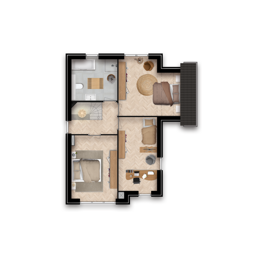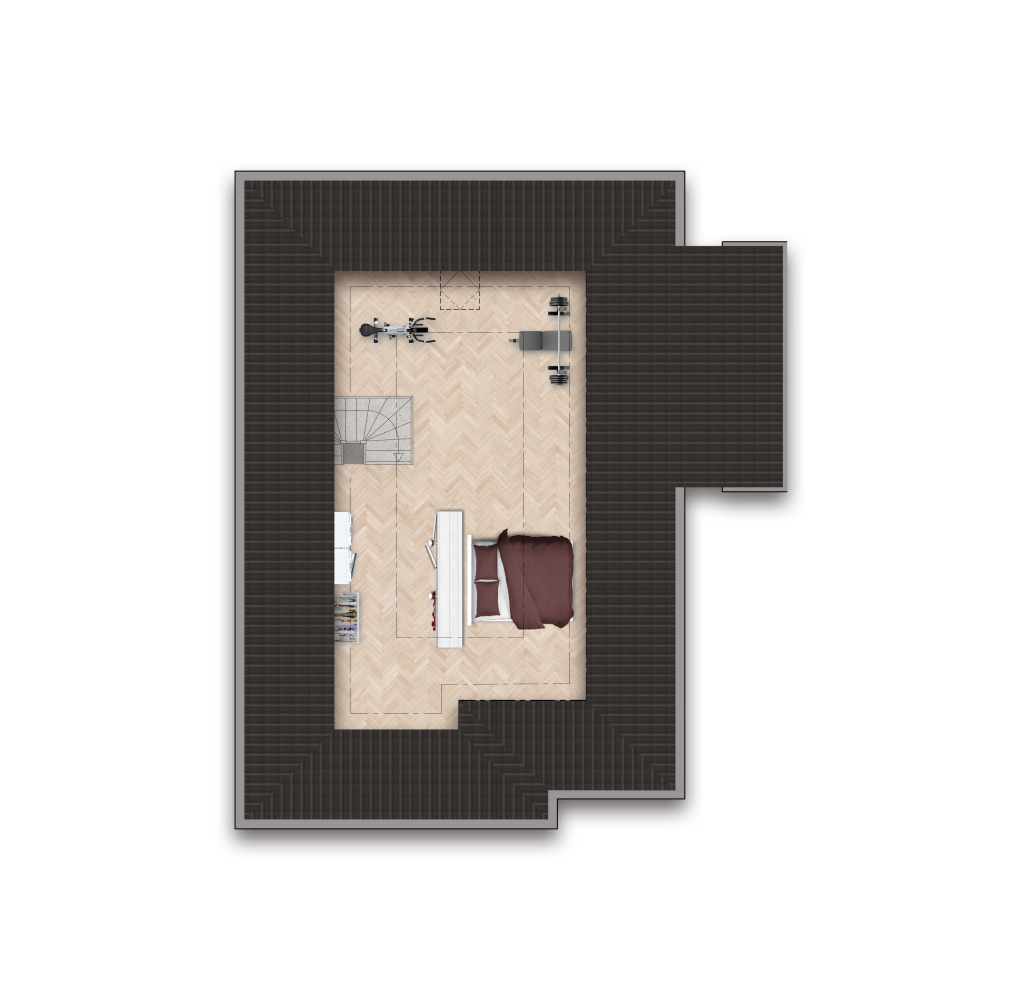 De tweede verdieping is verrassend ruim en multifunctioneel in te richten. Hier vind je een open ruimte die momenteel is ingericht als extra slaapkamer en werk-/hobbyruimte. Ook zijn hier de aansluitingen voor wasmachine en droger aanwezig.