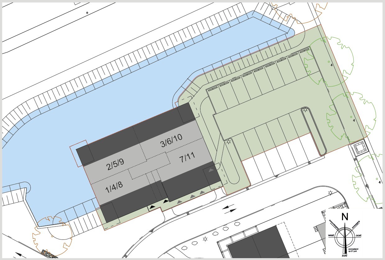 Een opvallend onderdeel in het plan is het appartementengebouw. Het is een bescheiden landmark, maar wel van afstand herkenbaar en passend bij de omgeving. 'Met zijn dubbele kap en klassieke pakhuissfeer voegt dit gebouw karakter toe aan de plek aan het water. Het ontwerp is een knipoog naar de pakhuizen van weleer, zoals die aan het Moleneind en langs de oude Drachtster Trekvaart stonden.