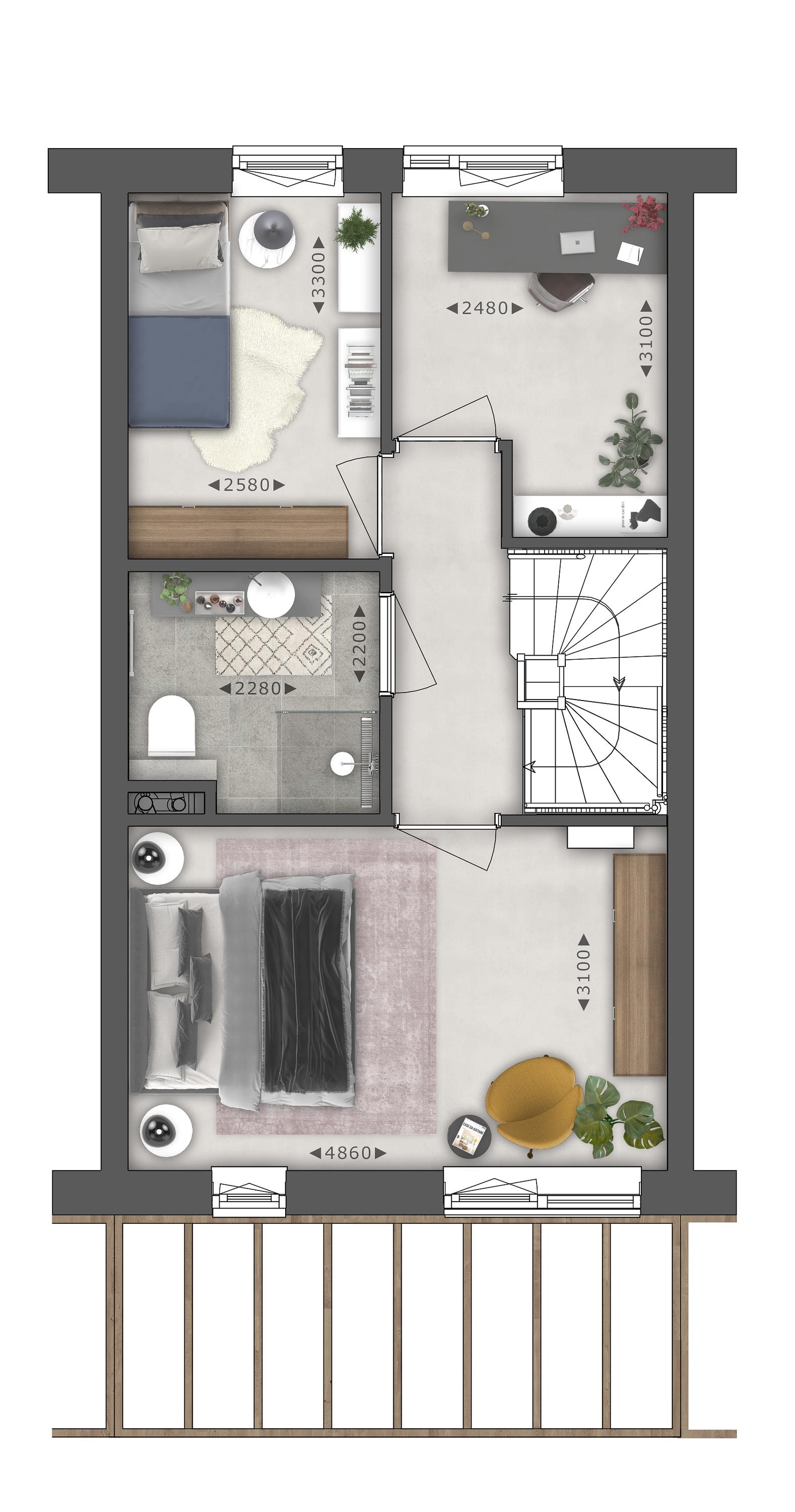 Stap binnen via de hal, waaraan een aparte toiletruimte ligt. Begin je dag met een kopje koffie of thee in de open keuken aan de voorzijde, of geniet van de rust in de woonkamer aan de achterzijde met uitzicht op je tuin. Op de eerste verdieping vind je 3 comfortabele slaapkamers - met de master slaapkamer over de breedte van de woning - en de badkamer met inloopdouche, wastafel en toilet. En de tweede verdieping? Daar vind je een vierde slaapkamer en een vrij indeelbare ruimte die je kunt inrichten zoals jij wilt!