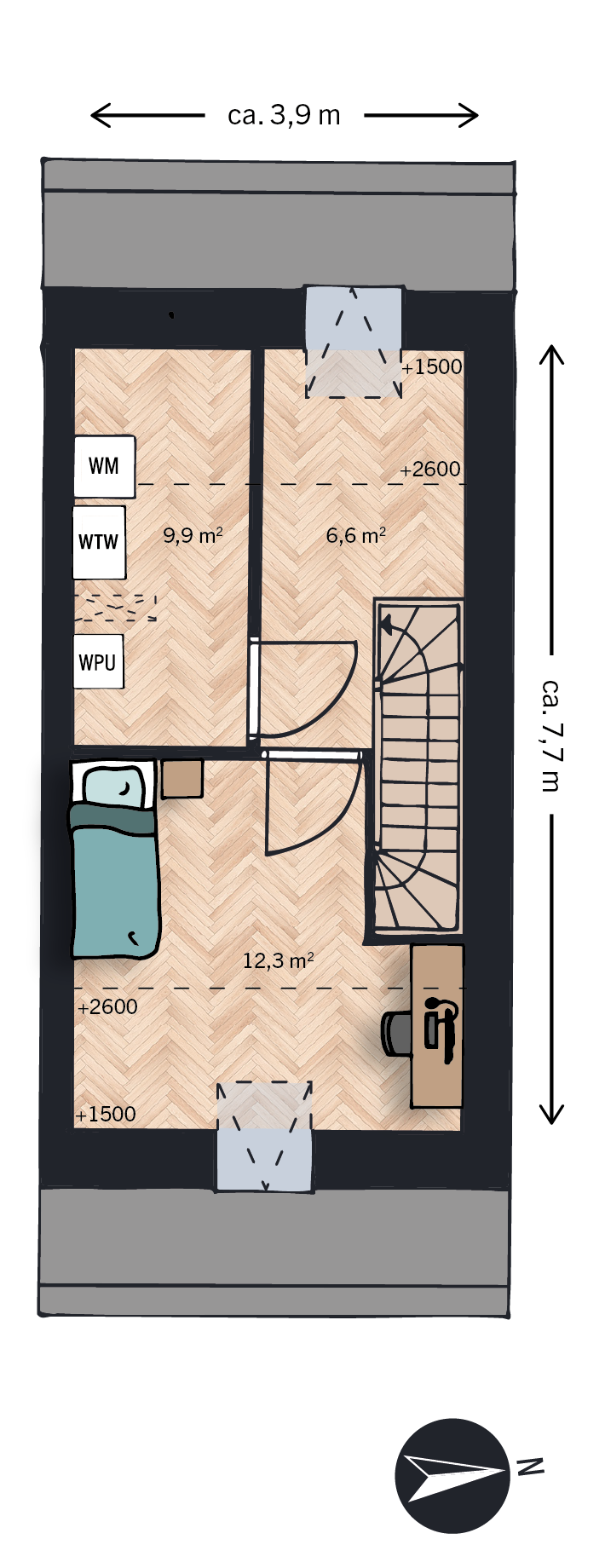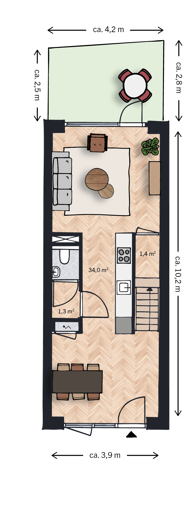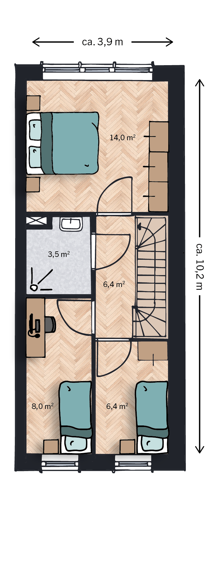 - Kaveloppervlakte van ca. 64 tot 73 m²