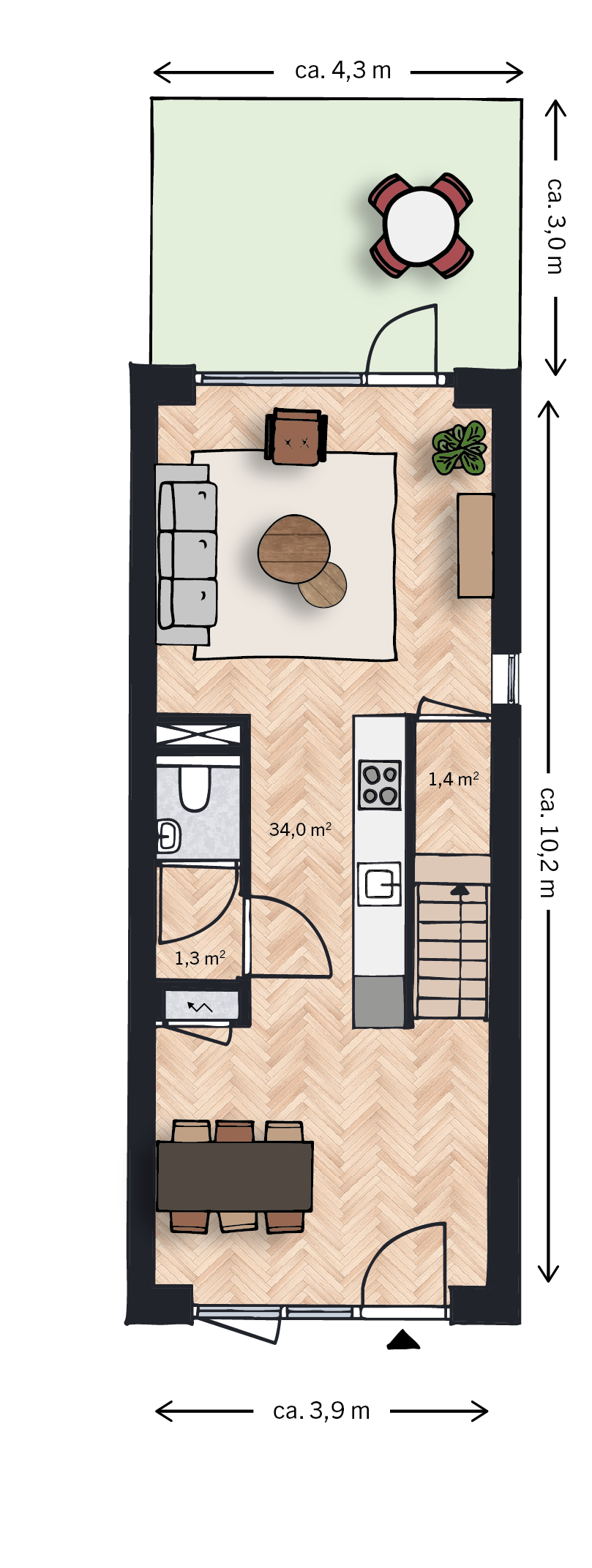 - Kaveloppervlakte van ca. 64 tot 73 m²