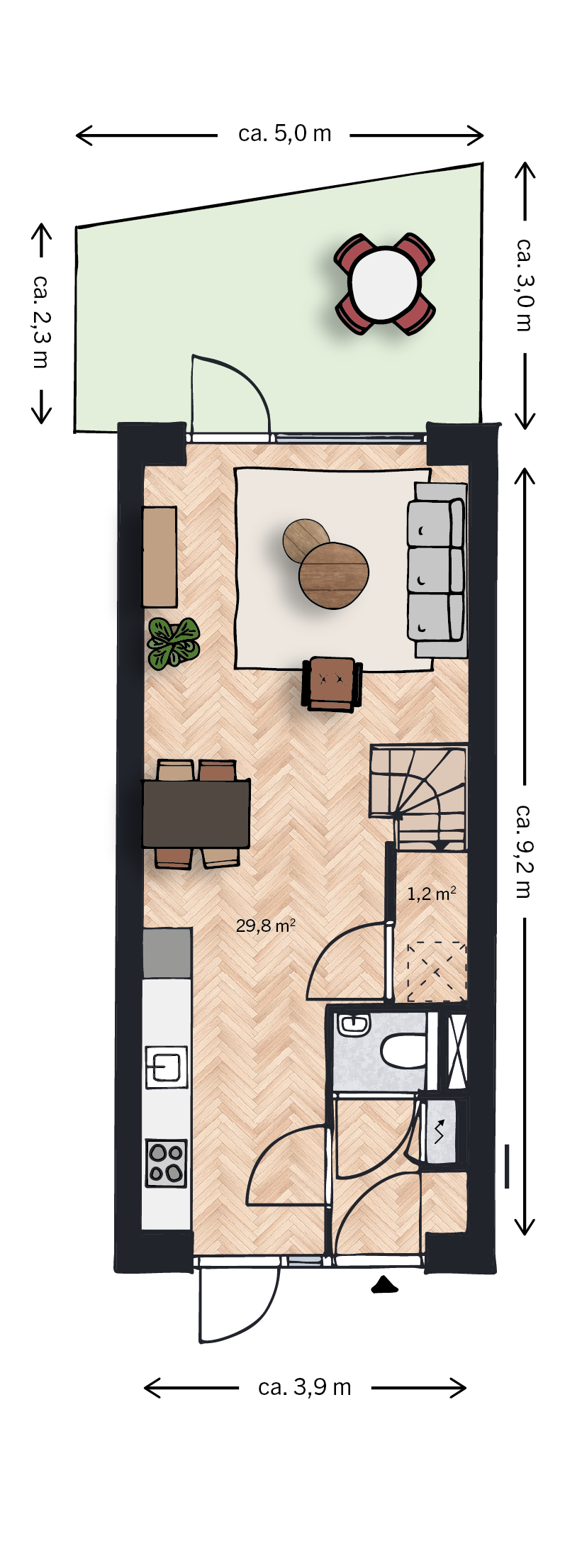 - Kaveloppervlakte van ca. 55 tot 58 m²