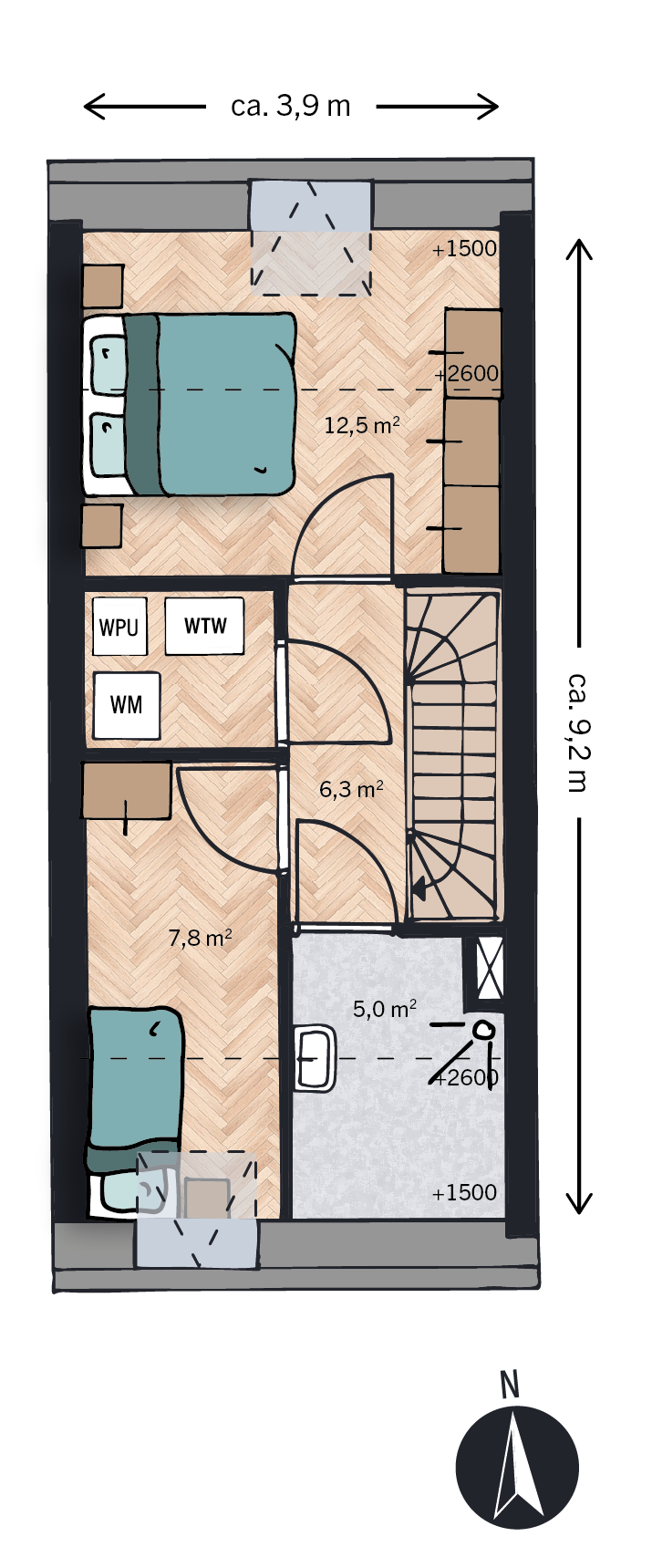 - Kaveloppervlakte van ca. 55 tot 58 m²
