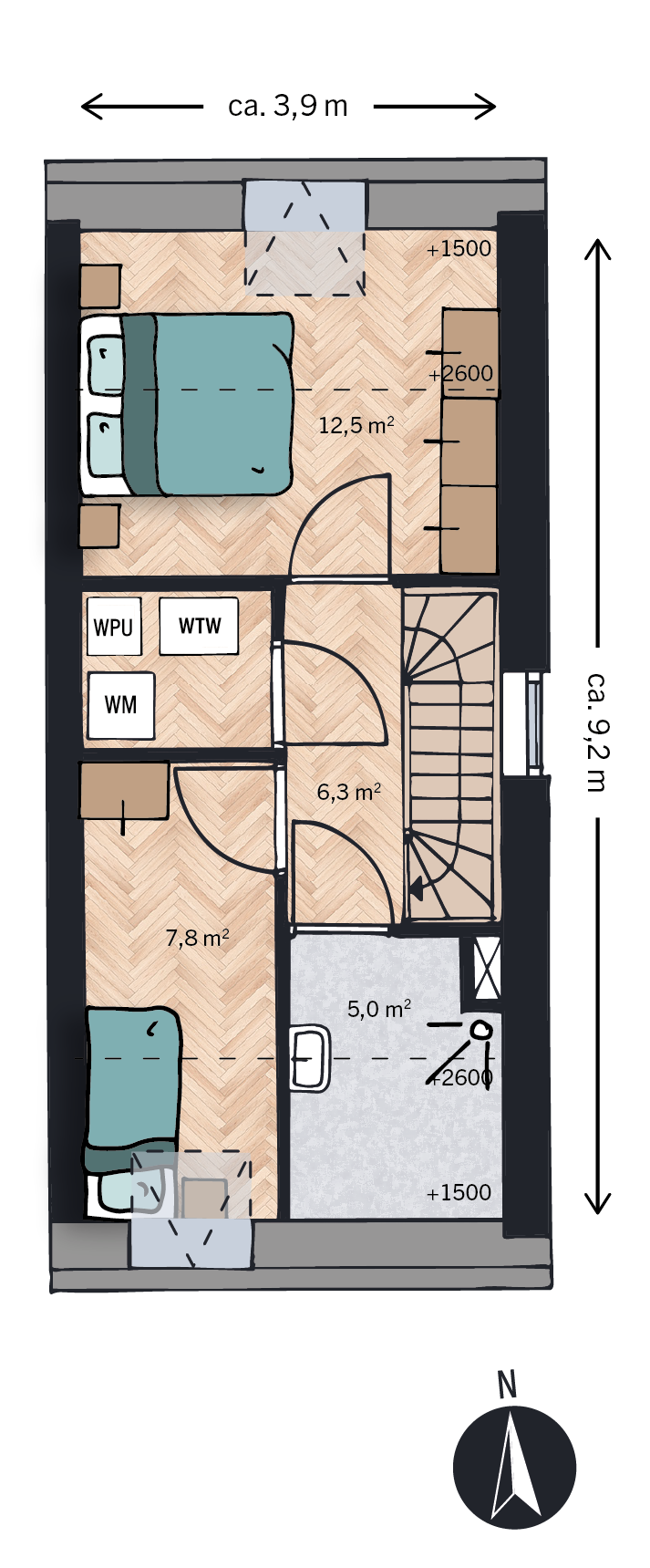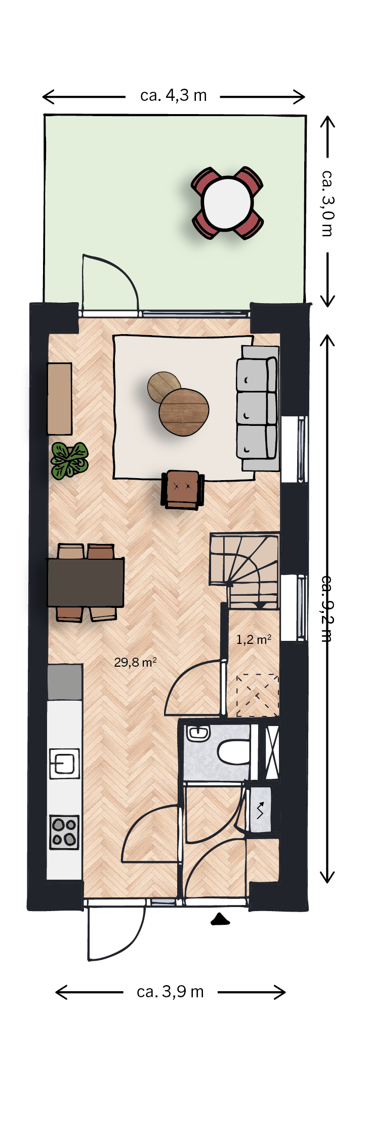 - Kaveloppervlakte van ca. 55 tot 58 m²