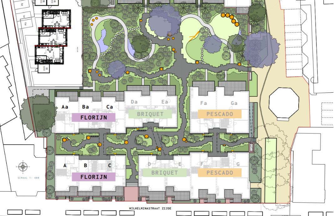 De appartementen op de begane grond krijgen een terras met een entree op de Wilhelminastraat. Ontsluiting van de bovenwoningen gaat middels een centraal geplaatste portiek met lift in een semi publieke binnenstraat. Deze binnenstraat ontsluit een bouwdeel gelegen aan de Wilhelminastraat en een bouwdeel dat zich oriënteert op de binnentuin. Onderling zijn deze bouwdelen verbonden middels luchtbruggen. Vanaf de levendige Wilhelminastraat loop je via steegjes de weldadige rust van de openbaar toegankelijke stadstuin in, dat feitelijk een daktuin boven de parkeerkelder wordt. De tuingevels openen zich maximaal aan de binnentuin, met meer glas en royale buitenruimtes.