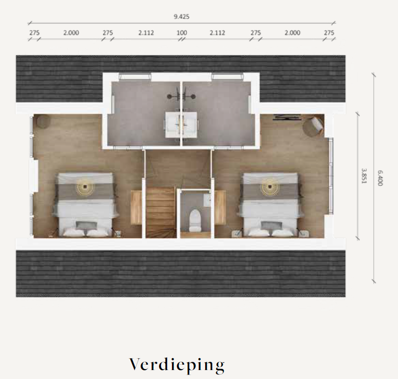 De 2 slaapkamers op de bovenverdieping zijn ruim opgezet en uitgerust met comfortabele boxsprings. Iedere slaapkamer heeft een eigen badkamer ensuite met wastafel en douche. De bovenverdieping is voorzien van een mooie parketvloer met vloerverwarming. Dit geeft de villa een luxe uitstraling en is daarbij zeer behaaglijk in de wintermaanden.