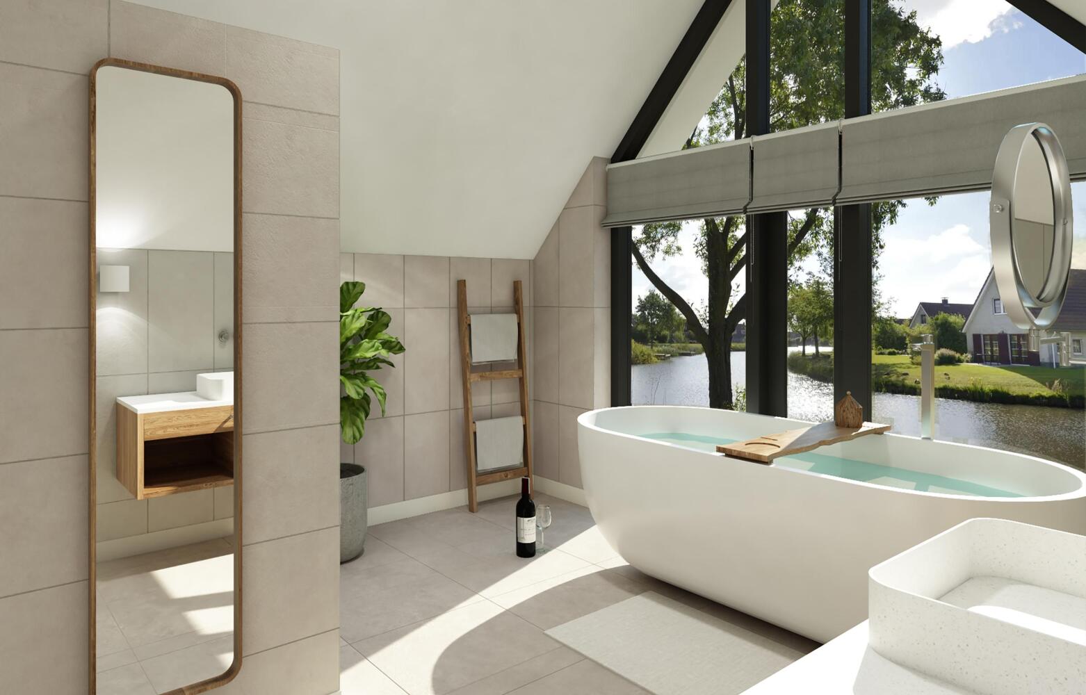 De exclusive wellness recreatievilla’s hebben een zachte en rustige uitstraling. Warme grijstinten als basis in combinatie met taupe en groen. De indeling van de woonkamer is gericht op de grote openslaande deuren zodat gasten mooi over het water uitkijken. De gebruikte materialen in de woning hebben een natuurlijke look & feel. Denk hierbij aan linnen, staal en riet. In combinatie met teakhout krijgt het resort een moderne en luxe sfeer.