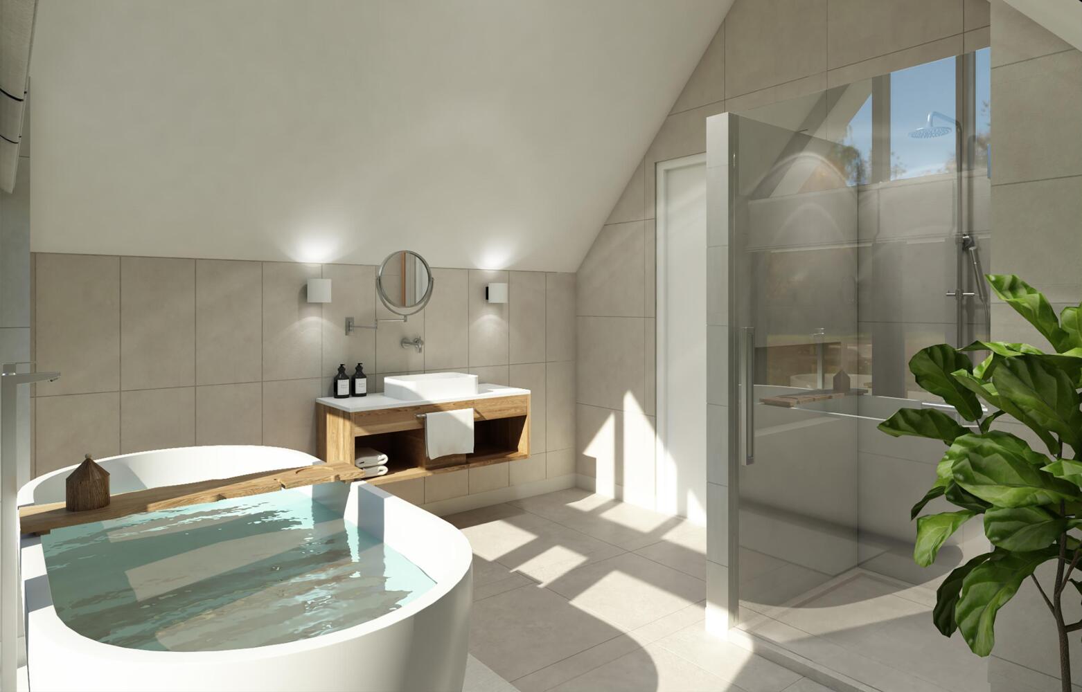Op de verdieping bevinden zich drie ruime slaapkamers, elk voorzien van een eigen badkamer met douche en toilet. Dit zorgt voor maximale privacy en comfort voor alle gasten. Daarnaast vindt u hier een grote saunaruimte, waar u heerlijk kunt ontspannen. De gekozen materialen en indeling van deze recreatievilla zorgen voor de optimale “wellness beleving”.