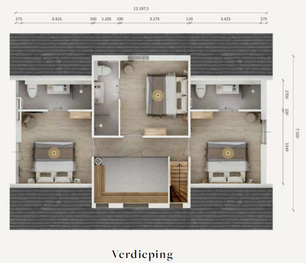Via een eikenhouten trap bereikt u de bovenverdieping. Deze biedt ruimte aan 3 slaapkamers. Alle slaapkamers beschikken over een eigen badkamer met douche en toilet. Hier is tevens een royale separate sauna te vinden. De vloeren zijn voorzien van een luxe parket houten vloer met vloerverwarming wat zorgt voor een warme en aangename sfeer.