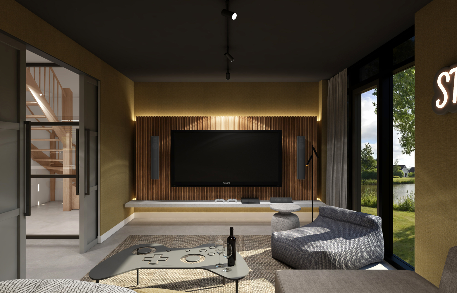 In de game villa is “the element of suprise” gebruikt. Zodra de schuifdeuren opengaan stapt u in een compleet andere wereld. De “game” kamer is voorzien van spelconsoles, maar kan ook als thuisbioscoop gebruikt worden. Geel en antraciet accentureren het stoere karaker van deze ruimte en deze kleuren zijn in zachtere vorm terug te vinden in de andere ruimtes van de villa.