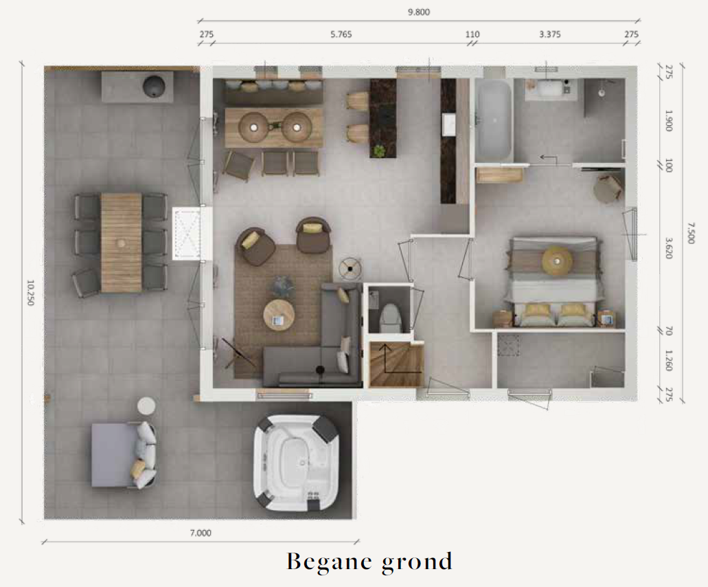 en een Quooker. Deze keuken is niet alleen functioneel, maar ook een uitnodigende plek om gezellig samen te zijn. De openslaande deuren bieden toegang tot het royale terras. Hier vindt u een prachtige pergola, die schaduw en sfeer biedt op zonnige dagen. Het terras is tevens uitgerust met luxe voorzieningen, waaronder een whirlpool waarin u heerlijk kunt ontspannen en genieten van het buitenleven.