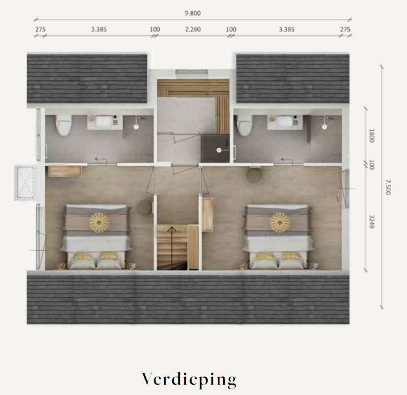 Via een eikenhouten trap bereikt u de bovenverdieping. Deze biedt ruimte aan de overige slaapkamers, badkamers en separate sauna met douche. De slaapkamers van de wellness recreatievilla’s voelen luchtig aan door de open puntkap. Alle slaapkamers beschikken over een eigen badkamer met douche en toilet.