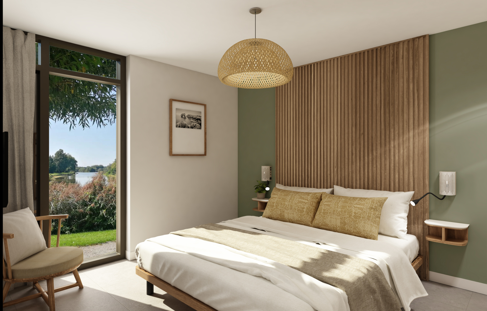 De exclusive wellness recreatievilla’s hebben een zachte en rustige uitstraling. Warme grijstinten als basis in combinatie met taupe en groen. De indeling van de woonkamer is gericht op de grote openslaande deuren zodat gasten mooi over het water uitkijken. De gebruikte materialen in de woning hebben een natuurlijke look & feel. Denk hierbij aan linnen, staal en riet. In combinatie met teakhout krijgt het resort een moderne en luxe sfeer.