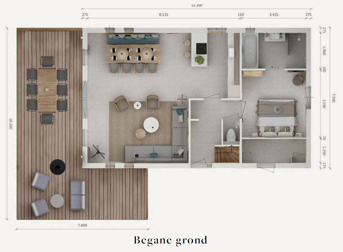 Aan de voorkant van de recreatievilla bevindt zich de royale “master bedroom” met badkamer ensuite. Deze luxe en royale badkamer is voorzien van ligbad en douche. De lichte woonkamer biedt een prachtg uitzicht over het terras dat aan het water is gelegen. De keuken is van alle gemakken voorzien, met onder andere een kookplaat met geïntegreerde afzuigkap, Quooker en wijnklimaatkast. Het royale terras is deels overkapt met een pergola, waardoor u hier heerlijk beschut kunt zitten. Verder is het terras uitgerust met tuinmeubilair, een luxe loungeset en buitenhaard.