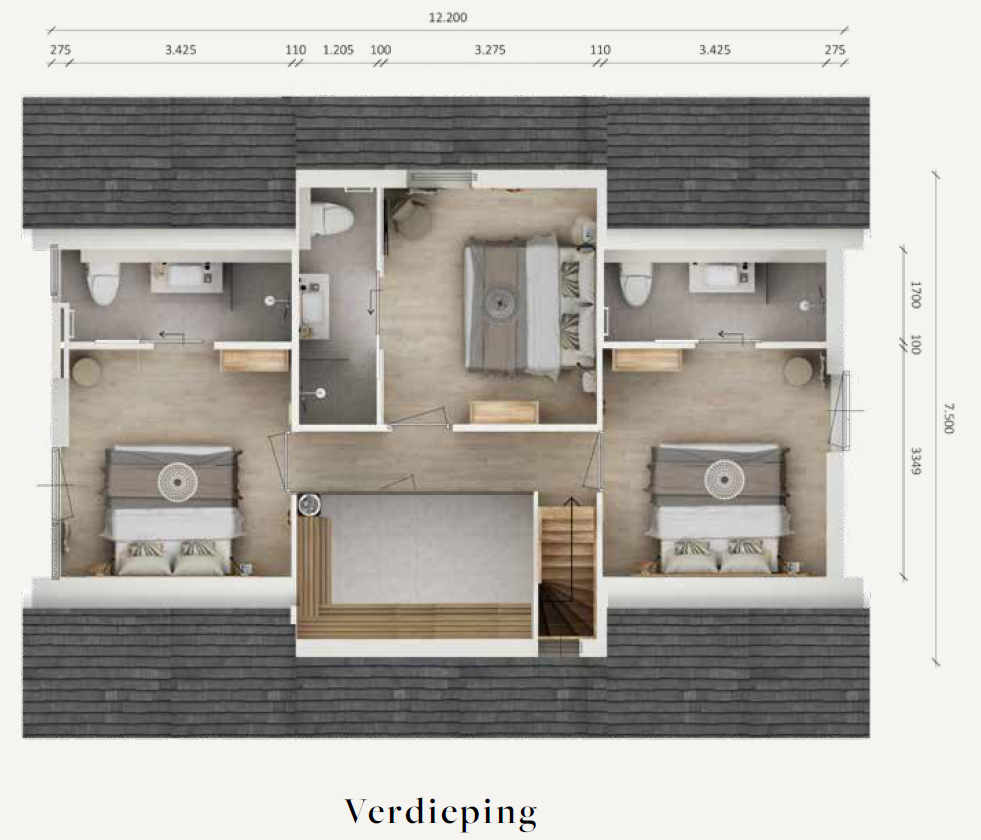 De bovenverdieping van deze 8-persoons recreatievilla heeft 3 slaapkamers die elk voorzien zijn van een eigen badkamer met wastafel, douche en toilet. Op de bovenverdieping is tevens een zeer ruime aparte saunaruimte te vinden.