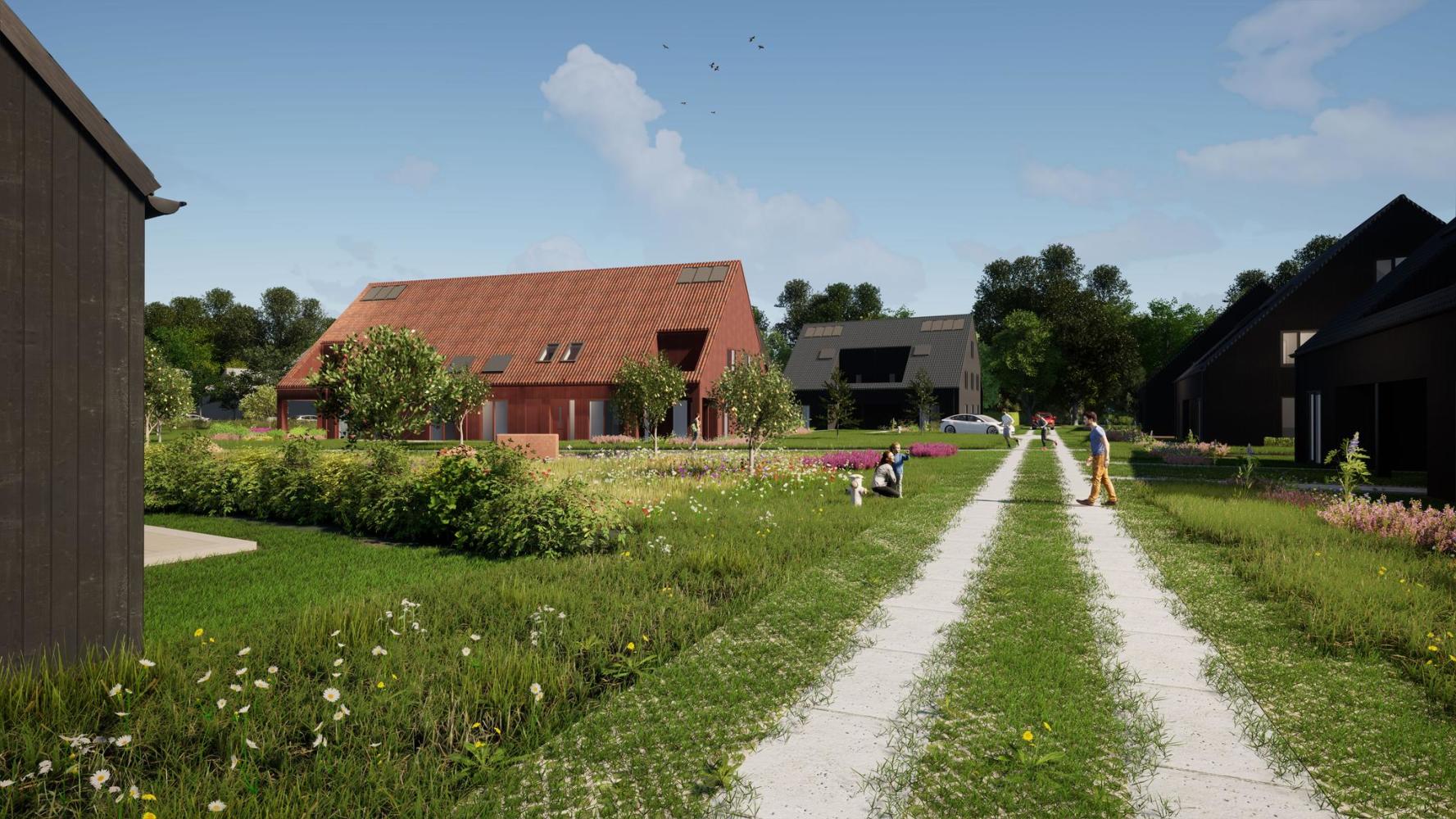 Vanaf de Leegeweg slingert een pad door de centrale binnenweide richting het Roege Bos. Ruimte tussen de woningen zorgt ervoor dat er vanaf de Leegeweg een doorzicht richting het Roege Bos ontstaat. Op deze manier wordt het potentieel van het groen decor achter de woningen onderdeel van de beleving van het terrein. De buurt wordt zo verkeersluw mogelijk door auto's uit het hart te weren en parkeren te organiseren uit het zicht of op de hoek gelegen parkeerplaatsen.