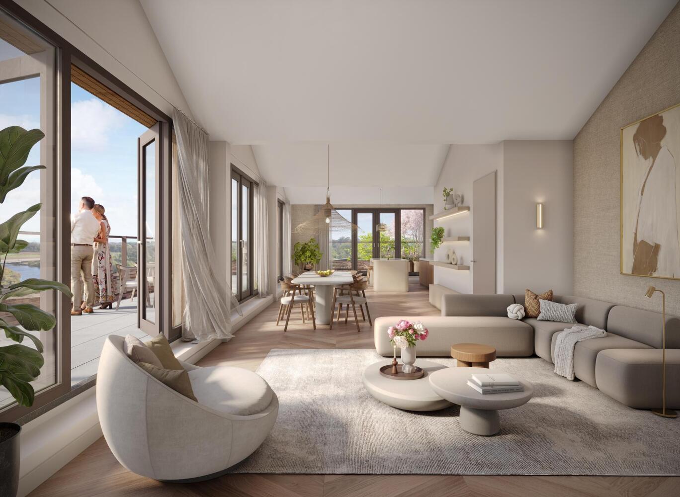 Alles aan De Vechtvliet straalt grandeur uit. Neem bijvoorbeeld de imposante entree met hoog plafond. Daarmee geef je aan je bezoek een visitekaartje af dat zegt: ‘Hier betreed je een wereld van luxe en gastvrijheid.’ Dit woongebouw aan de Vecht telt vijf woonlagen, met op de begane grond voor elk appartement een eigen berging.