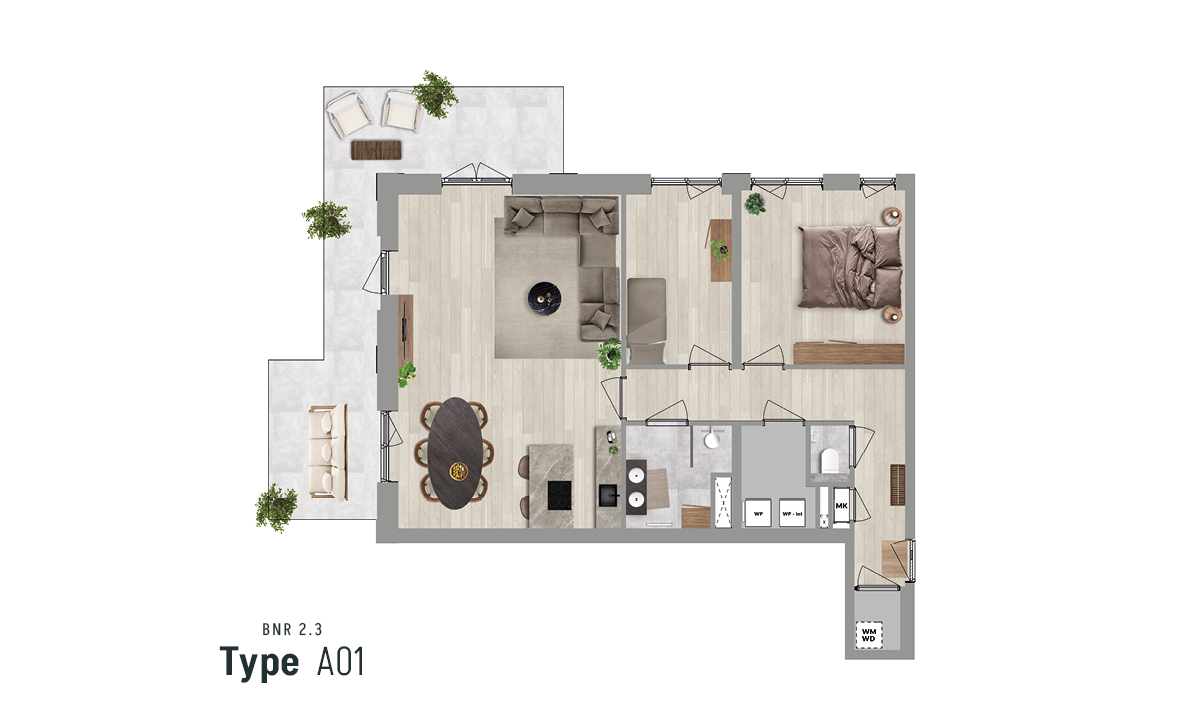 Binnen kom je via een royale gang, die toegang geeft tot washok, toilet, technische ruimte, twee slaapkamers en een badkamer. De living heeft ruimte voor een knusse zithoek, eethoek en een open keuken met optie voor een semi-kookeiland. Via dubbele openslaande deuren stap je zo het terras op, waar plek is voor