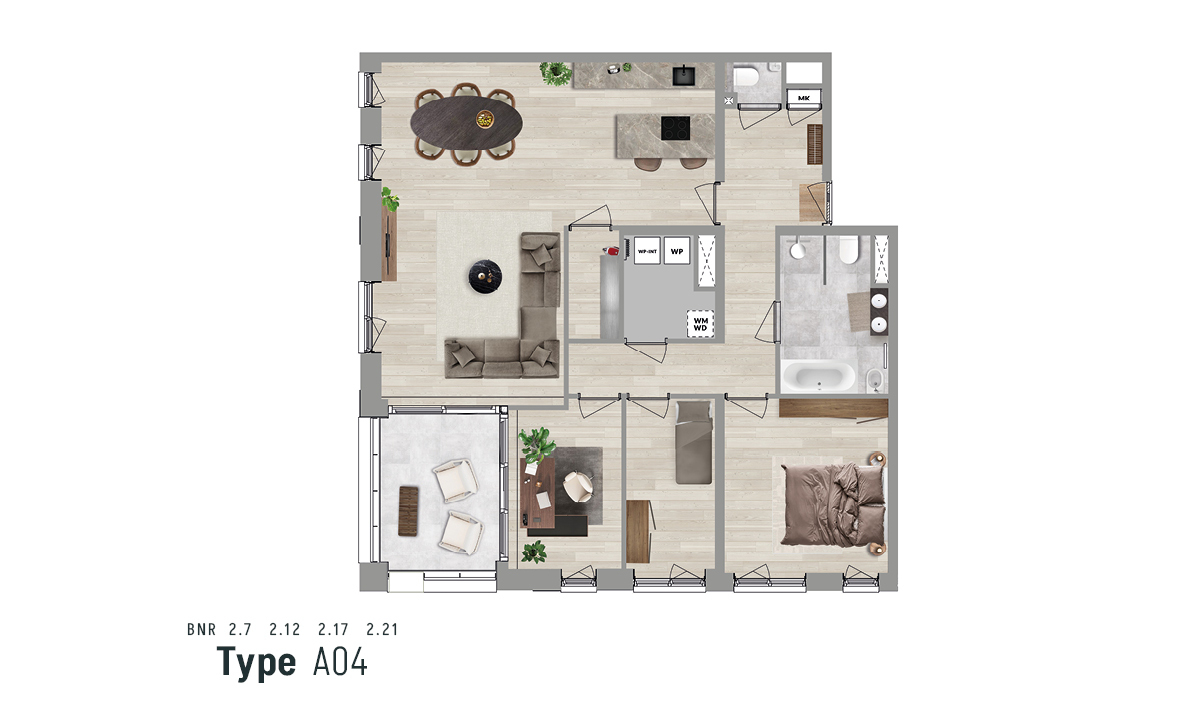 Dit type appartement ligt op de eerste, tweede, derde en vierde verdieping. Het heeft een inpandig balkon op de zonzijde. Een royale hal met toilet geeft toegang tot de L-vormige living met open keuken en ruimte voor een semi-kookeiland en verder een extra ruimte die als voorraadkast kan dienen. Vanuit de hal loop je via een gang naar de badkamer, drie slaapkamers en technische ruimte annex wasruimte.