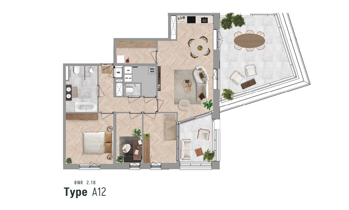 Ook van dit appartement is er maar een. Het ligt op de vierde verdieping en beschikt over een inpandig balkon op de zonzijde. Het heeft een living met open keuken en toegang tot een aparte bijkeuken. Met maar liefst drie slaapkamers is het heerlijk ruim. Verder een badkamer met wastafel, toilet, douche, een tweede toilet en een technische ruimte annex washok. Als kers op de taart heeft dit appartement een riant dakterras, vanwaar je weids uitkijkt over het rivierenlandschap en de stad
