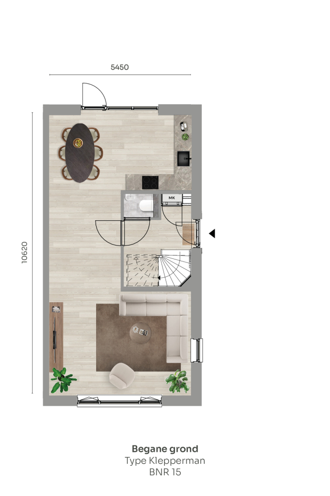 Begane grond: Ruime hal/entree met toilet. Vanuit hier betreedt u de lichte en sfeervolle woonkamer met open keuken. Grote raampartijen zorgen voor een prettige lichtinval en bieden uitzicht op de tuin.