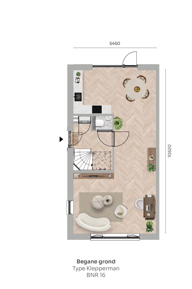 Begane grond: Ruime hal/entree met toilet. Vanuit hier betreedt u de lichte en sfeervolle woonkamer met open keuken. Grote raampartijen zorgen voor een prettige lichtinval en bieden uitzicht op de tuin.