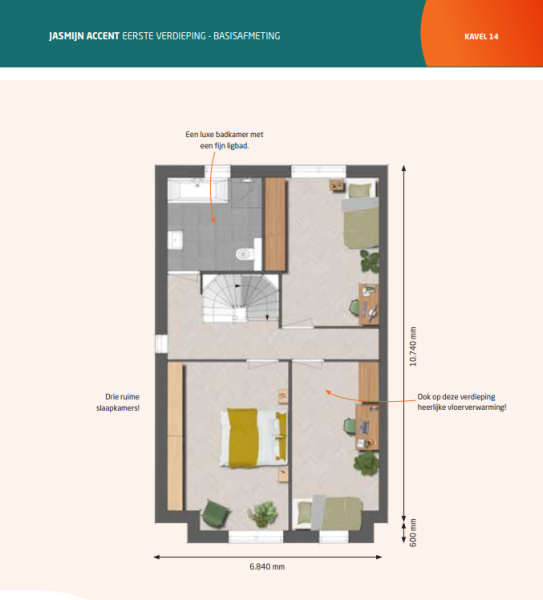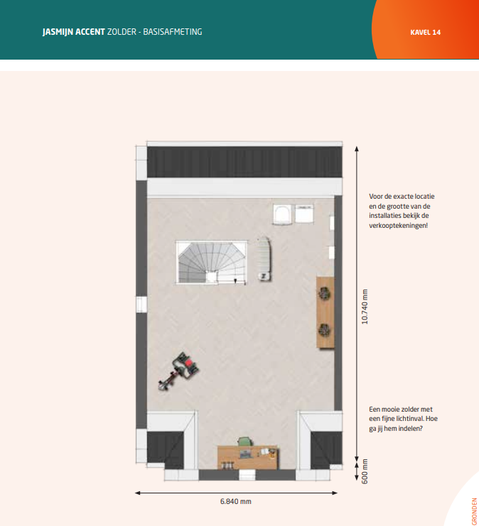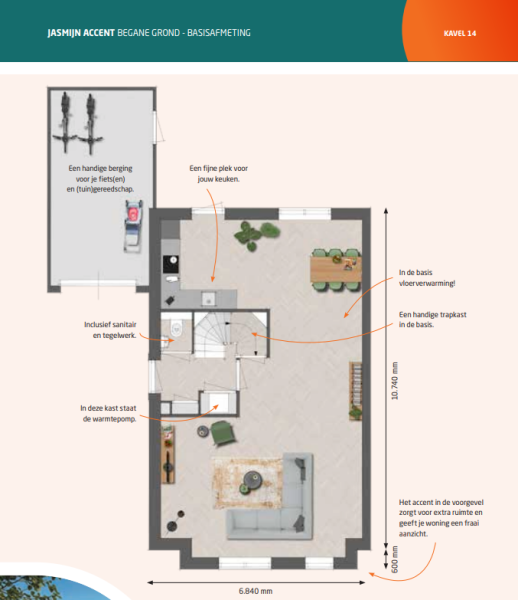 De accentwoning (bouwnummer 14) van woningmodel Jasmijn is een woning met vele mogelijkheden. Het accent in de voorgevel geeft extra leefruimte. Het accent kan ook optioneel gekozen worden bij bouwnummer 8, 22, 60, 64 en 67.