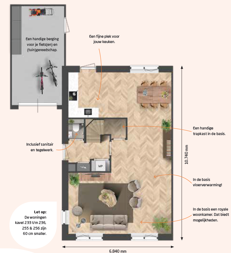 Het woningmodel Jasmijn biedt talloze mogelijkheden. Met een breedte van 6,24 of 6,84 meter en een diepte van 10,74 meter, is deze woning verrassend ruim. De accentwoning van woningmodel Jasmijn is 6,84 meter breed en 10.74 meter diep. Het accent in de voorgevel geeft extra leefruimte. De woonkamer aan de voorzijde biedt volop ruimte voor een comfortabele zithoek, terwijl de achterzijde perfect is voor het realiseren van je ideale keuken. Bovendien is er een aangebouwde stenen berging, erg handig!