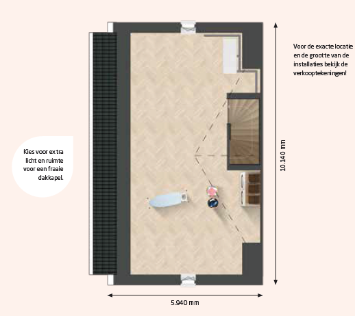 De zolder is een perfecte plek voor een speelruimte voor de kinderen of voor extra bergruimte. Hier is de aansluiting voor de wasmachine en de technische installaties staan hier ook.