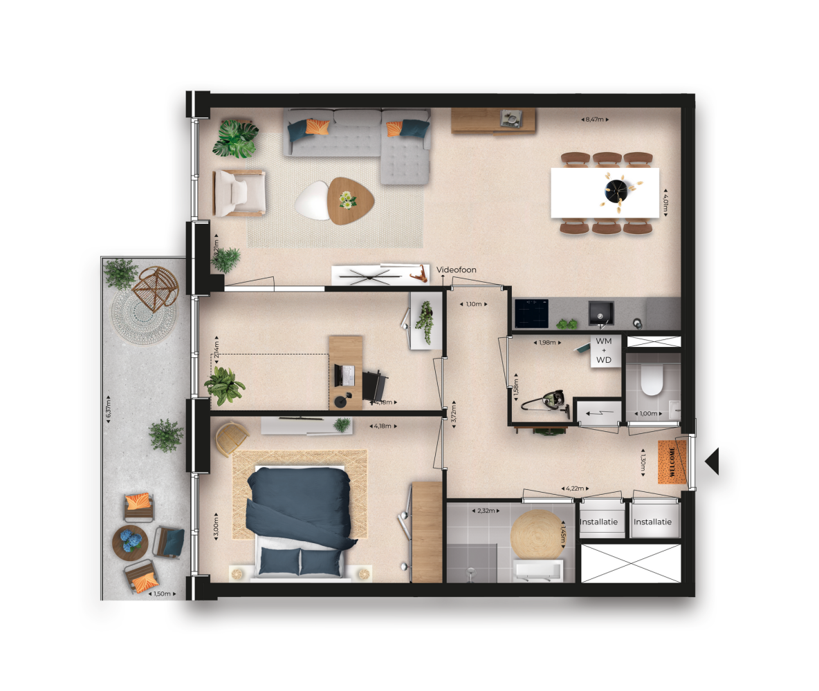 - De wand tussen de woonkamer en de slaapkamer is voorzien van een sparing voor directe toegang naar het balkon vanuit de woonkamer