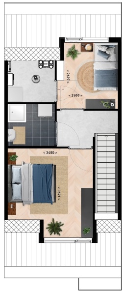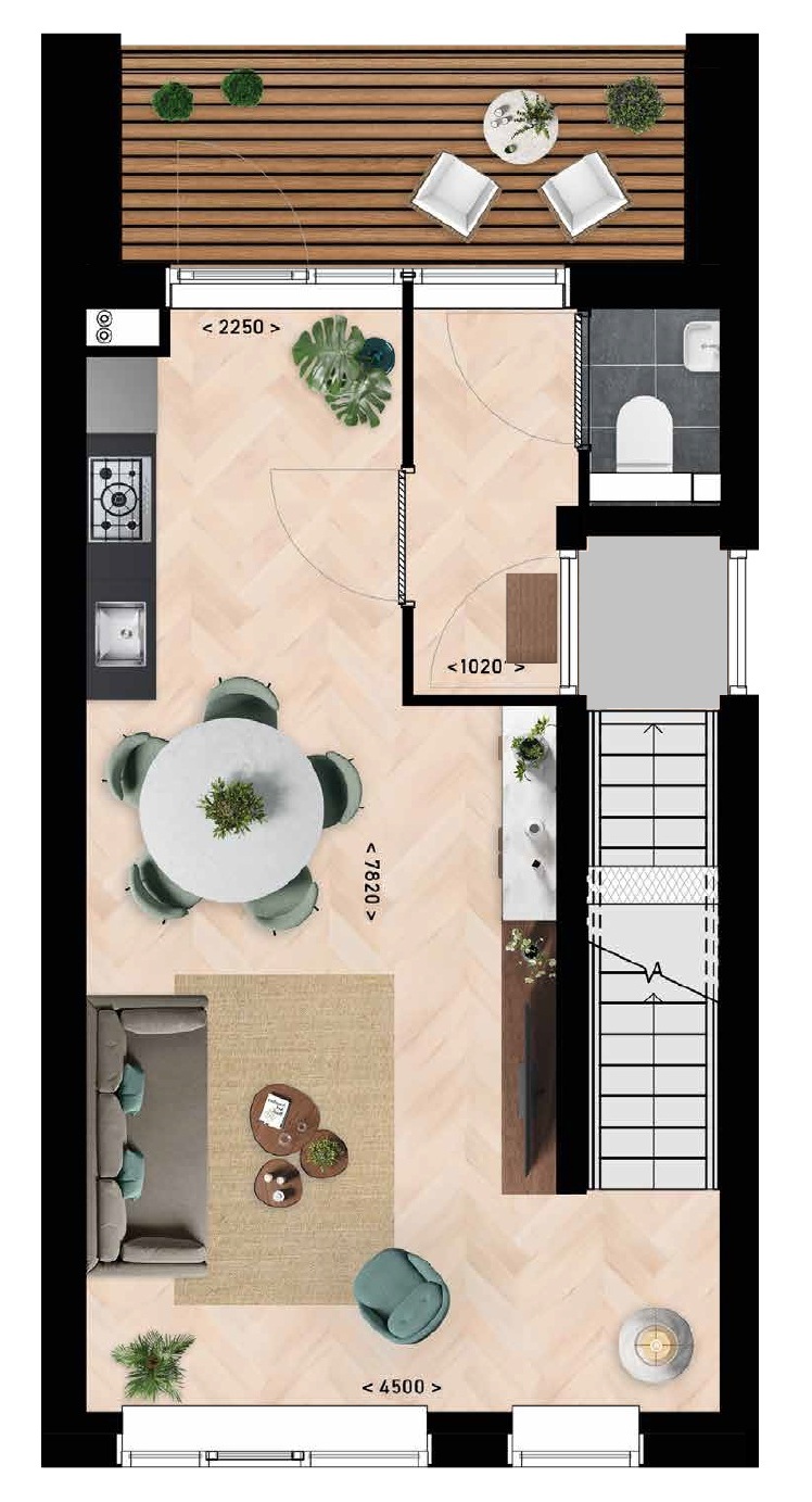 Op de eerste verdieping vind je achter de eigen voordeur een woonkeuken aan de achterzijde, compleet met een privé balkon, terwijl de woonkamer is gericht op het zuidwesten, perfect om te genieten van de avondzon.