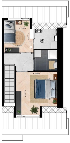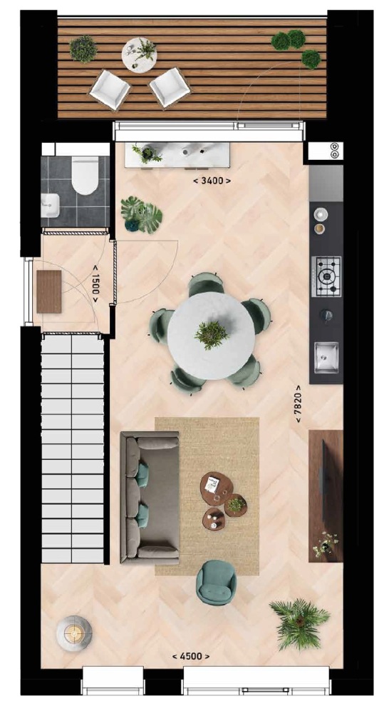 Op de eerste verdieping vind je achter de eigen voordeur een woonkeuken aan de achterzijde, compleet met een privé balkon, terwijl de woonkamer is gericht op het zuidwesten, perfect om te genieten van de avondzon.