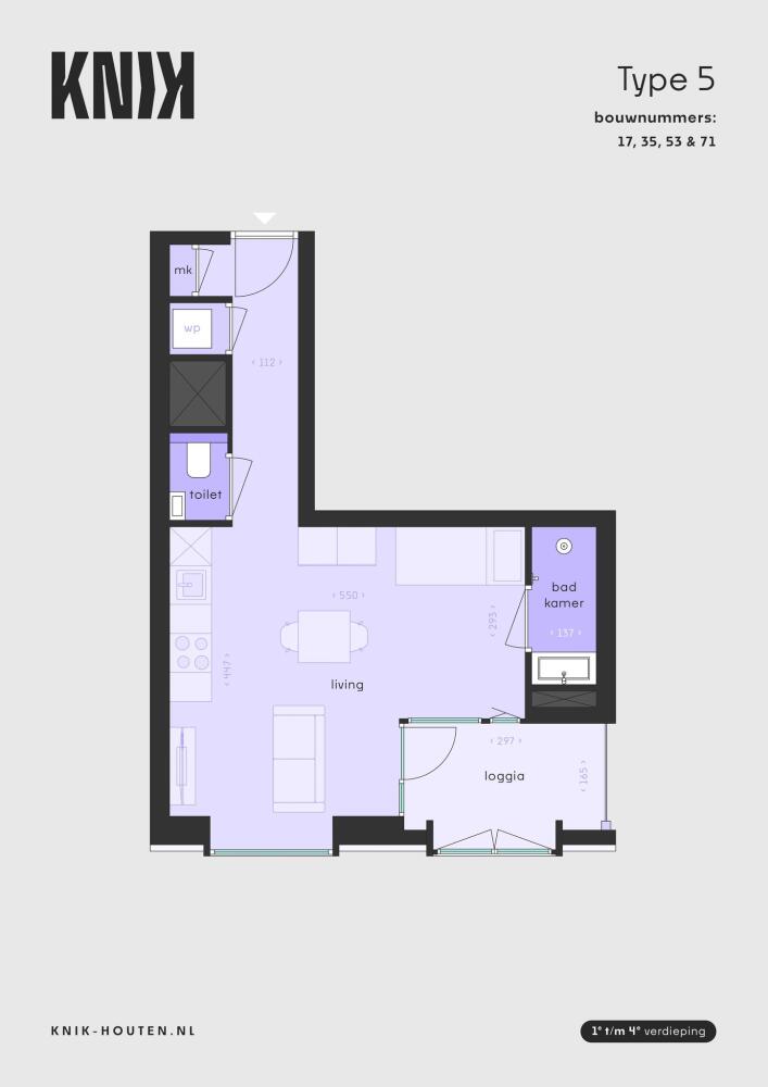 Een ruimtelijk studio appartement met open indeling en een twist. Via je entree kom je in je open leefruimte met aangrenzende, af te sluiten loggia. Zo haal je ook in de winter buiten naar binnen.