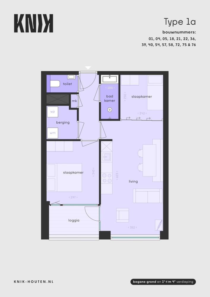 Wonen in appartement 1a voelt rijk. Met twee slaapkamers waarvan één toegang biedt tot de loggia, een eigen berging en een separaat toilet, kun je alle kanten op. Daarnaast is het ook mogelijk om de keukenpositie te verplaatsen, waardoor de woonkamer extra ruimte biedt. Een appartement met een open indeling waarbij je tweede slaapkamer met een schuifwand af te sluiten is.