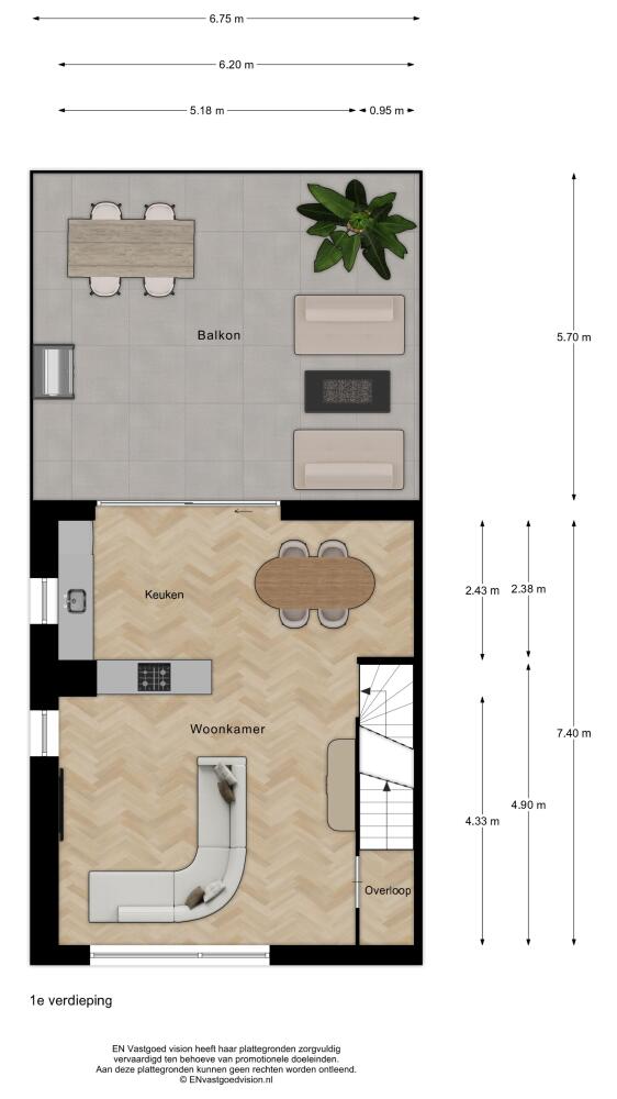 Eerste verdieping: royale woonkamer met driezijdige lichtinval. Living gericht op het Zuideinde. Trapopgang. Leefkeuken (casco opgeleverd en voorbereid voor elektrisch koken) met mogelijkheid schiereiland. Schuifpui naar terras van 39 m2, gericht op het oosten.