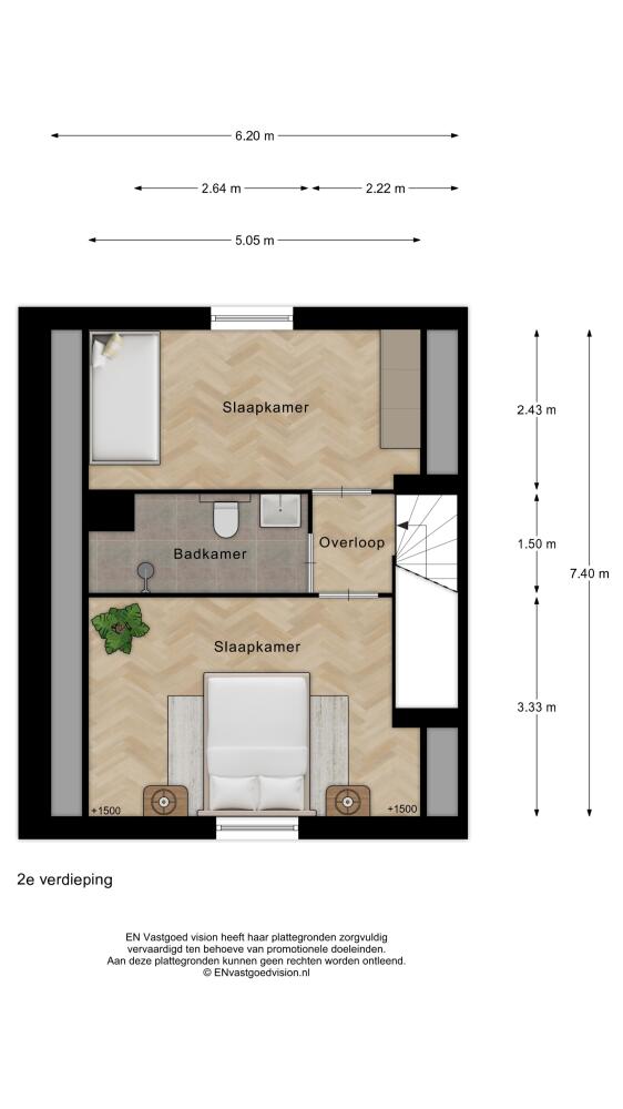 Op de tweede verdieping zijn de andere slaapkamers plus een tweede badkamer te vinden. Beide slaapkamers beslaan de hele gevelbreedte en beschikken over een manshoog raam. De slaapkamer aan de kant van het dakterras - en Zaan - heeft eveneens een dakraam.
