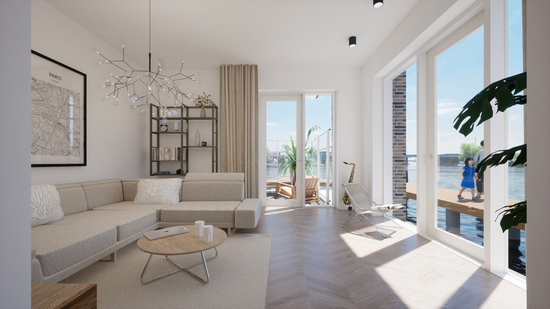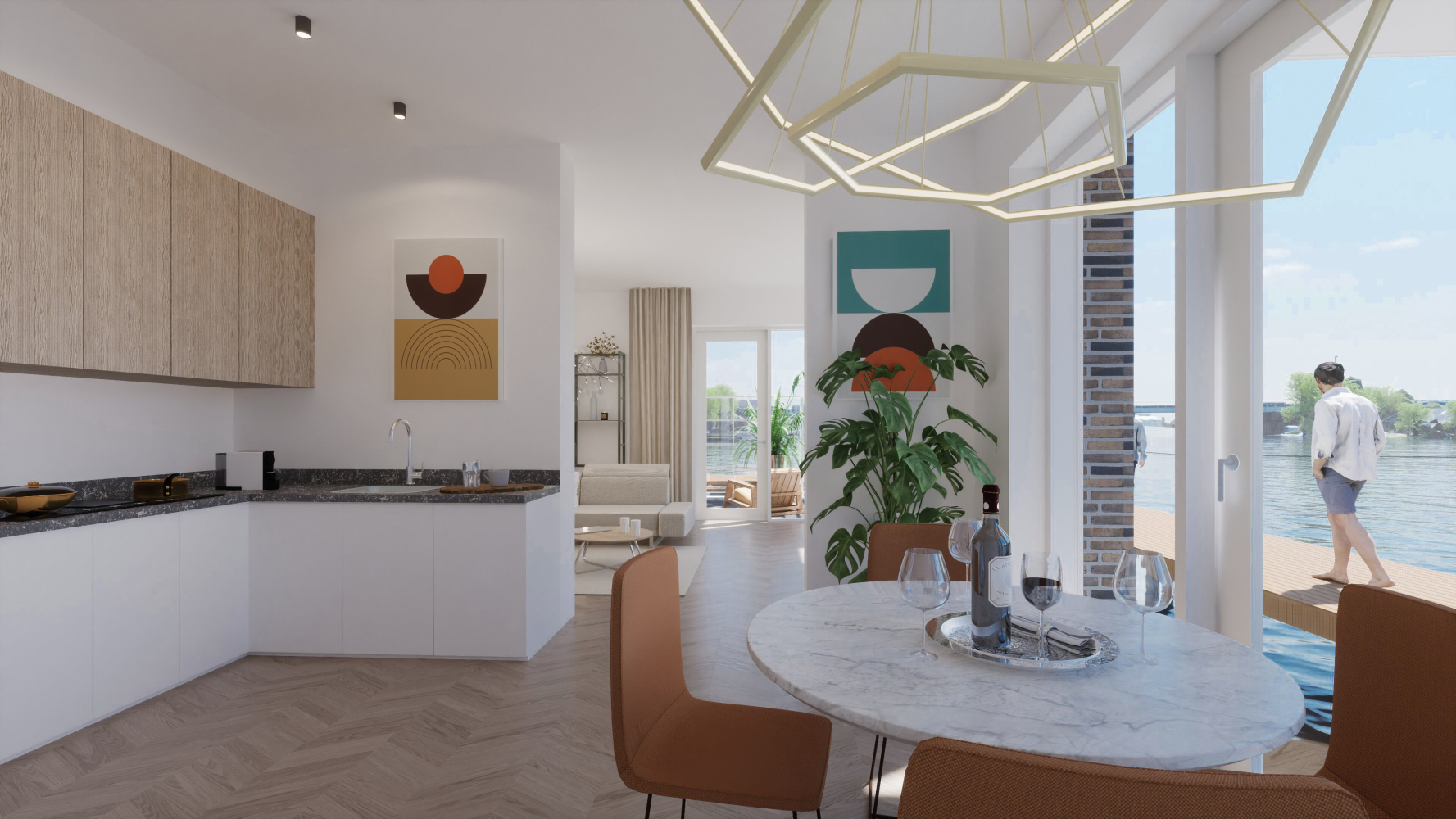 Lichte casco leefkeuken met Zaanzicht. Aansluitend living met eveneens gevelgrote raampartijen en openslaande deur naar tuin aan de Zaanoever.