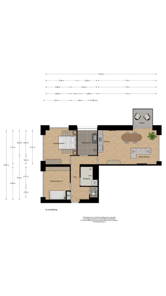 1e Etage: gezamenlijke hal. Entree appartement. Hal met meterkast. Berging met mechanische ventilatie en boiler, aansluitingen wasmachine en -droger. Twee slaapkamers, met gevelhoge raampartijen.