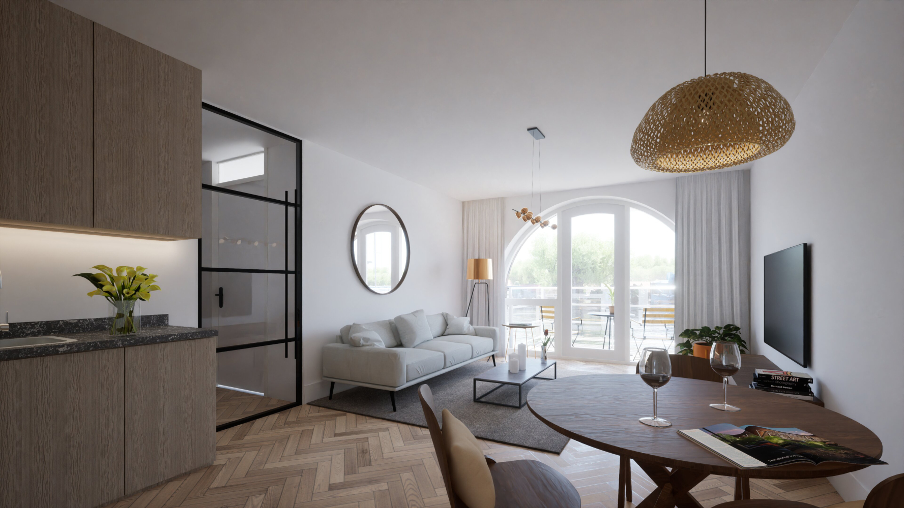 Woonkamer met casco op te leveren leefkeuken, verbonden met de living. Deze is voorzien van gevelgrote raampartijen en glazen draaideur naar balkon aan de Zaan.