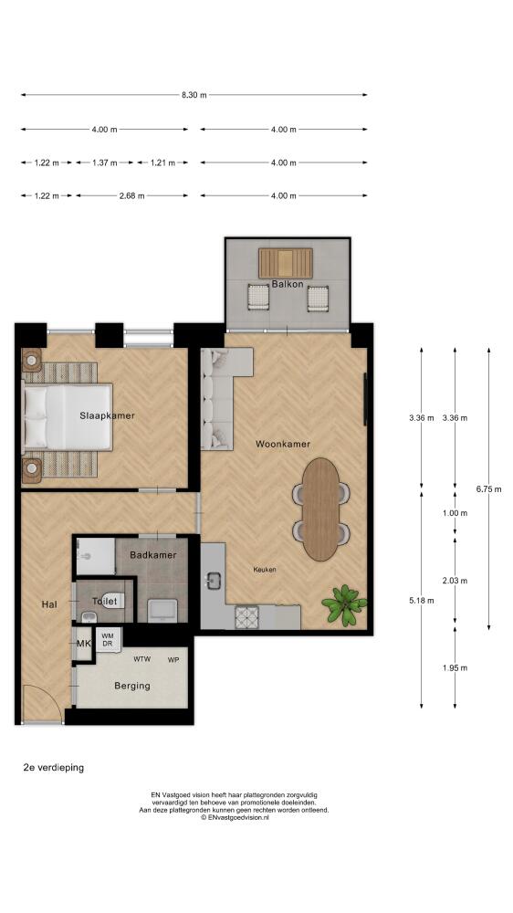 2e Etage: gemeenschappelijke overloop. Entree appartement. Gang. Berging met installaties WTW, mechanische ventilatie en boiler, aansluitingen wasmachine en -droger. Meterkast. Geheel betegelde toiletruimte met wandcloset en fontein. Eveneens betegelde badkamer met inloopdouche en wastafel. Uitbreiding van het sanitairpakket is een kopersoptie. Slaapkamer (ruim 13 m2) met gevelhoge draairaampartij en direct zicht op de Zaan.