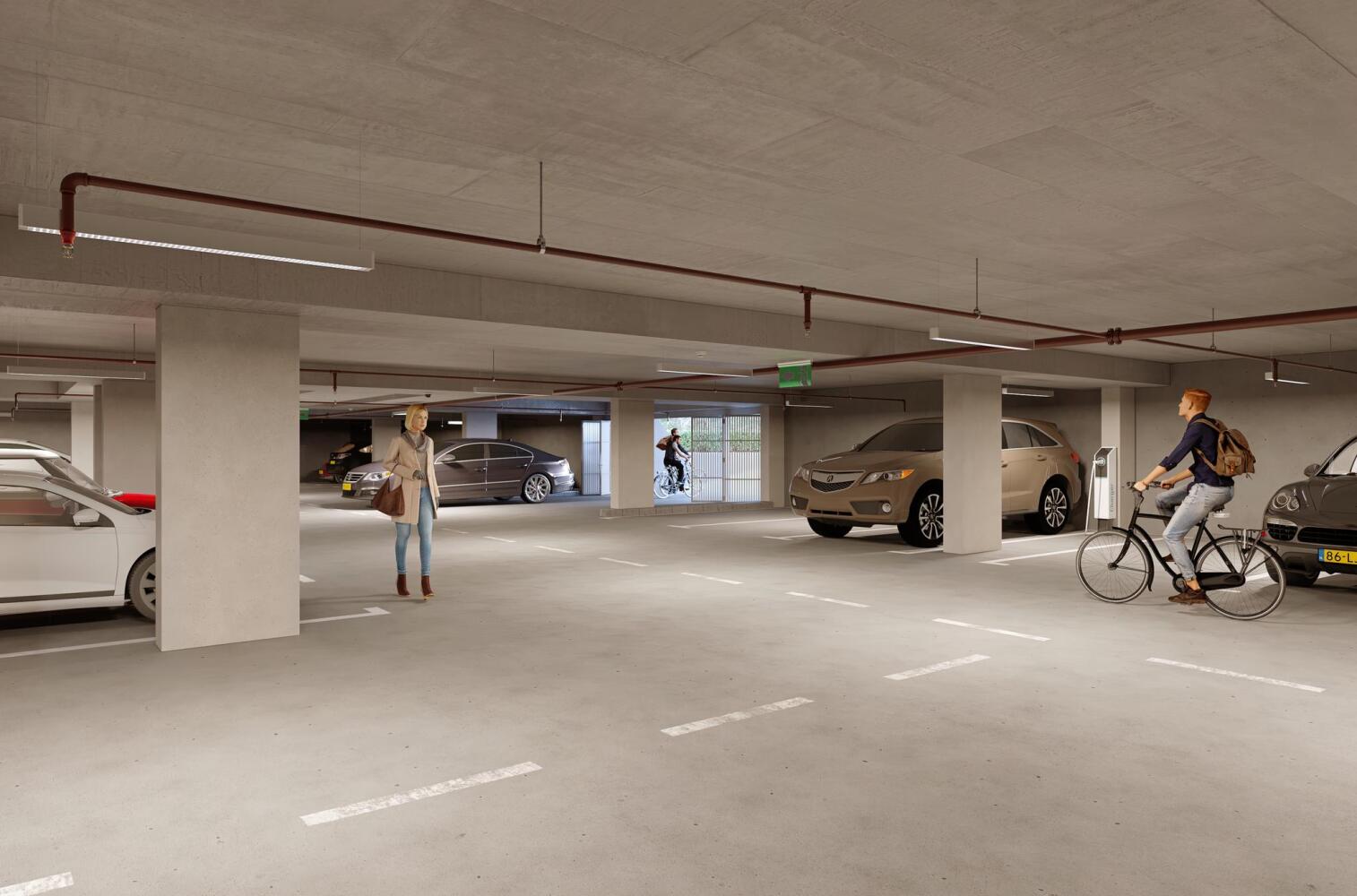 De gebouwen staan op een collectieve, half verdiepte parkeergarage. De toegang van de parkeergarage zit aan de noordzijde. U rijdt een klein stukje naar beneden en parkeert de auto op de voor u gereserveerde plaats.