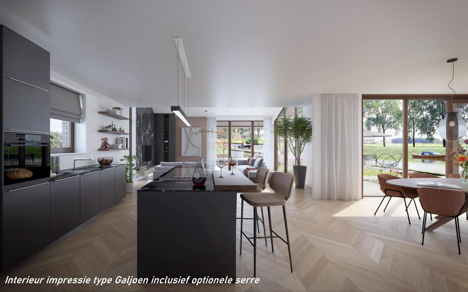 Dit prachtig ontworpen ‘Longhouse’, heeft een bijzondere, asymmetrische kap. De ruime living en keuken beschikken over grote raampartijen en openslaande deuren die de omgeving als het ware naar binnen halen. Het extra hoge plafond in de living zorgt voor een echt buitengevoel, een gevoel van vrijheid. Galjoen is daarbij een flexibele woning die zich moeiteloos aanpast aan uw wensen. Zo kunt u kiezen voor een extra werkkamer of slaap- en badkamer op de begane grond. Goed voor jarenlang woonplezier. Ook is er de mogelijkheid om de woning uit te breiden, bijvoorbeeld met een stijlvolle, glazen serre. En vanuit de woning stapt u zo in uw boot en vaart u de vrijheid tegemoet. Galjoen is uw perfecte thuishaven. Nu en in de toekomst.