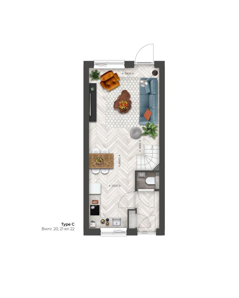 Op een bijzonder mooie plek aan de groenstrook liggen de drie tussenwoningen van type C. Met een smallere beukmaat zijn de woningen compacter van opzet, maar niet