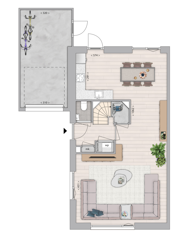 Even binnenkijken? Via de voordeur aan de zijkant stap je in de hal met toegang tot het toilet, meterkast, technische ruimte, deur naar de woonkamer en trap naar de 1e verdieping. Het woongedeelte is een open ruimte met plek voor een fijne leefkeuken met openslaande deur naar de achtertuin. Creëer aan de voorkant een lekkere zithoek en vanuit je grote raam kijk je uit op de groene voortuin. Heerlijk, niet? In de aangebouwde stenen berging heb je ruimte voor een extra koelkast of de fietsen, handig!