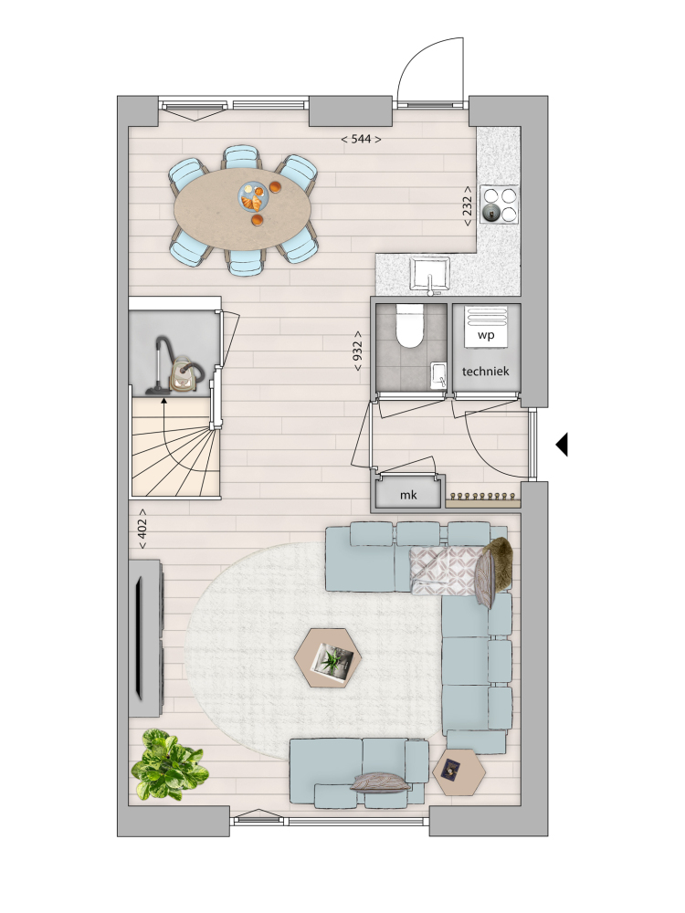 Even binnenkijken? Via de voordeur aan de voorkant stap je in de hal met toegang tot het toilet, meterkast, technische ruimte, deur naar de woonkamer en de trap naar de 1e etage. Het woongedeelte is een open ruimte met plek voor een fijne leefkeuken met openslaande deur naar de straatkant. Creëer aan de achterkant een lekkere zithoek en hier zit nog een openslaande deur naar de ruime tuin. Heerlijk! In de houten berging heb je extra bergruimte.