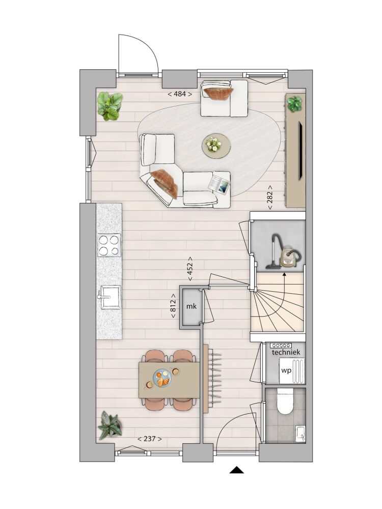 Even binnenkijken? Via de voordeur aan de voorkant stap je in de hal met toegang tot het toilet, meterkast, technische ruimte, deur naar de woonkamer en de trap naar de 1e etage. Het woongedeelte is een open ruimte met plek voor een fijne leefkeuken met openslaande deur naar de straatkant. Creëer aan de achterkant een lekkere zithoek en hier zit nog een openslaande deur naar de ruime tuin. Heerlijk! In de houten berging heb je extra bergruimte.