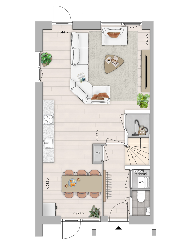 Even binnenkijken? Via de voordeur aan de voorkant stap je in de hal met toegang tot het toilet, meterkast, technische ruimte, deur naar de woonkamer en de trap naar de 1e etage. Het woongedeelte is een open ruimte met plek voor een fijne leefkeuken met openslaande deur naar de straatkant. Creëer aan de achterkant een lekkere zithoek en hier zit nog een openslaande deur naar de ruime tuin. Heerlijk! In de houten berging heb je extra bergruimte.