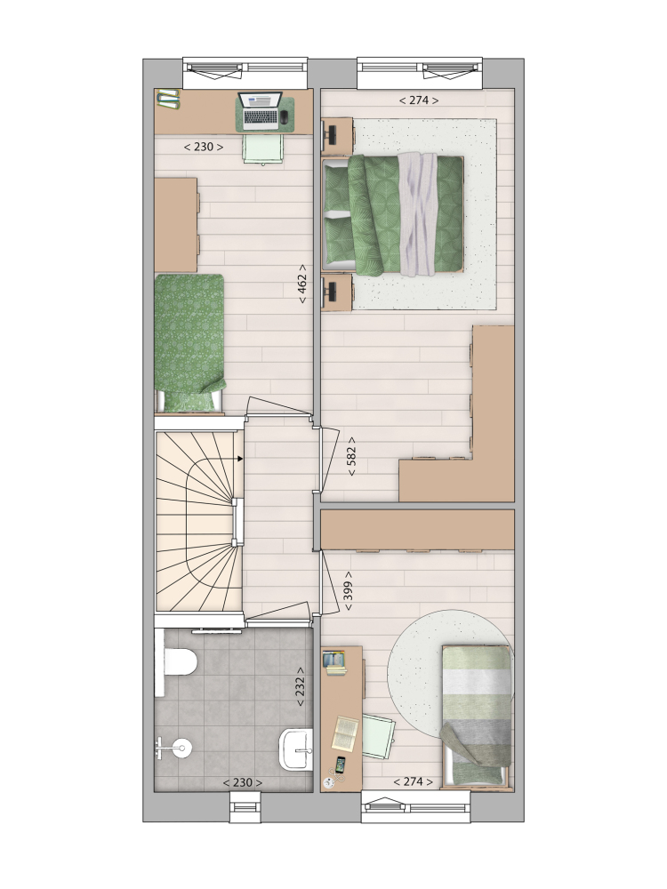 Let op: het door de ontwikkelaar opgegeven gebruiksoppervlak kan afwijken van het daadwerkelijke woonoppervlak! Bij het gebruiksoppervlak kunnen ook bergzolders, bergingen of andere ruimten zijn gerekend, terwijl deze volgens de NEN2580 niet als woonoppervlak zijn aan te merken. Afhankelijk van de mogelijkheden kunt u bijvoorbeeld voor een bergzolder een dakraam toepassen, waardoor deze ruimte eventueel alsnog als woonoppervlak kan worden gerekend. Vraag de makelaar voor meer informatie en eventuele mogelijkheden.