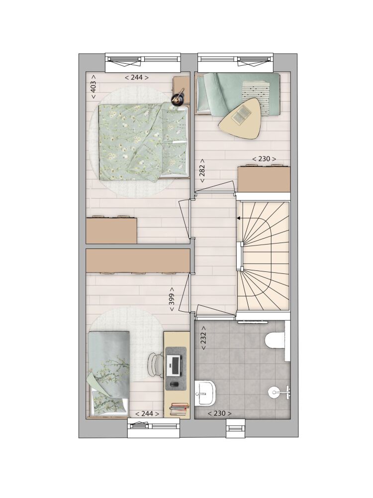 Let op: het door de ontwikkelaar opgegeven gebruiksoppervlak kan afwijken van het daadwerkelijke woonoppervlak! Bij het gebruiksoppervlak kunnen ook bergzolders, bergingen of andere ruimten zijn gerekend, terwijl deze volgens de NEN2580 niet als woonoppervlak zijn aan te merken. Afhankelijk van de mogelijkheden kunt u bijvoorbeeld voor een bergzolder een dakraam toepassen, waardoor deze ruimte eventueel alsnog als woonoppervlak kan worden gerekend. Vraag de makelaar voor meer informatie en eventuele mogelijkheden.